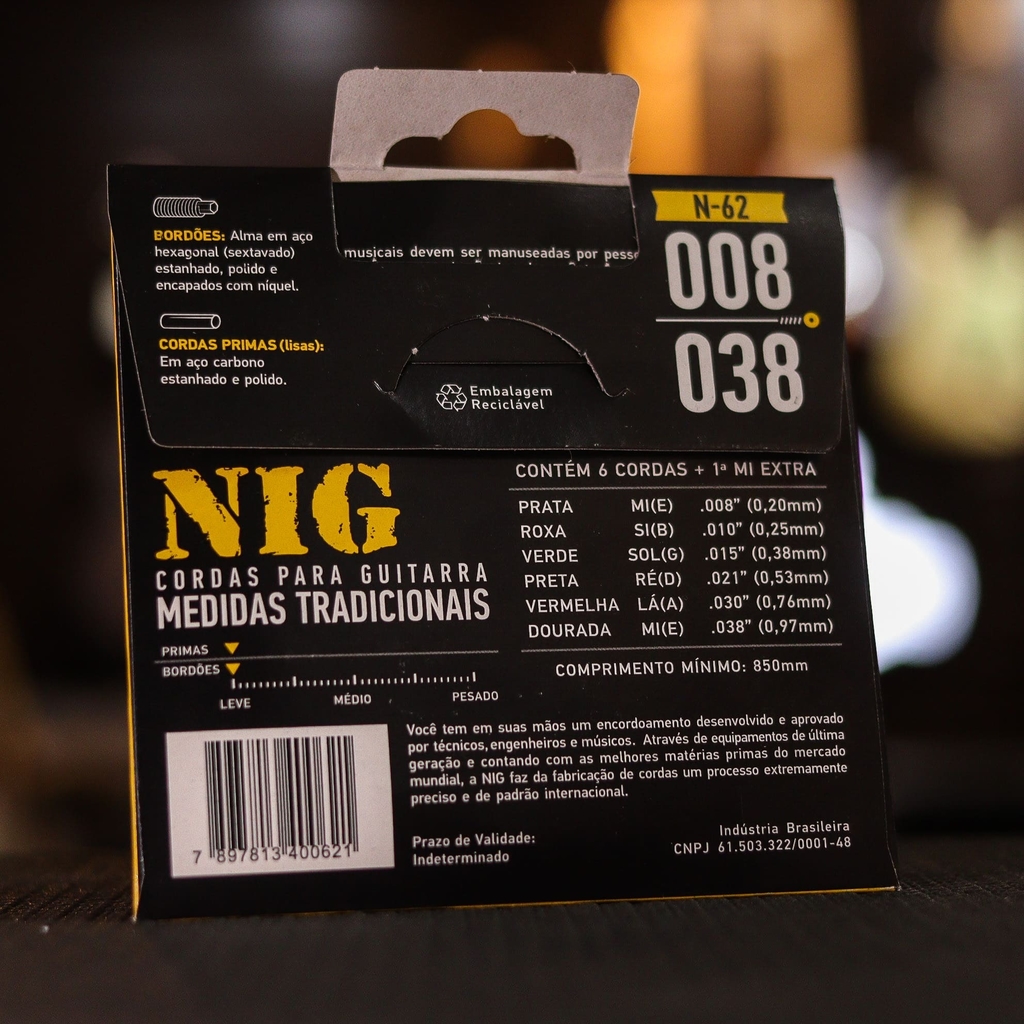 A corda para guitarra NIG é produzida com alma em aço hexagonal (sextavado) estanhado, polido e encapada com níquel. Um Encordoamento desenvolvido e aprovado por técnicos, engenheiros e músicos.