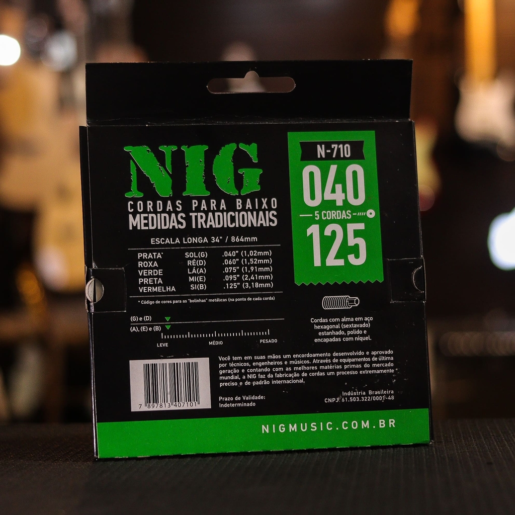 A corda para baixo NIG é produzida com alma em aço hexagonal (sextavado) estanhado, polido e encapada com níquel. Um Encordoamento desenvolvido e aprovado por técnicos, engenheiros e músicos.