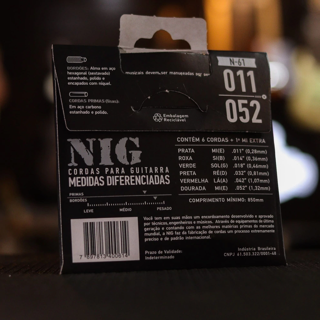 A corda para guitarra NIG é produzida com alma em aço hexagonal (sextavado) estanhado, polido e encapada com níquel. Um Encordoamento desenvolvido e aprovado por técnicos, engenheiros e músicos.