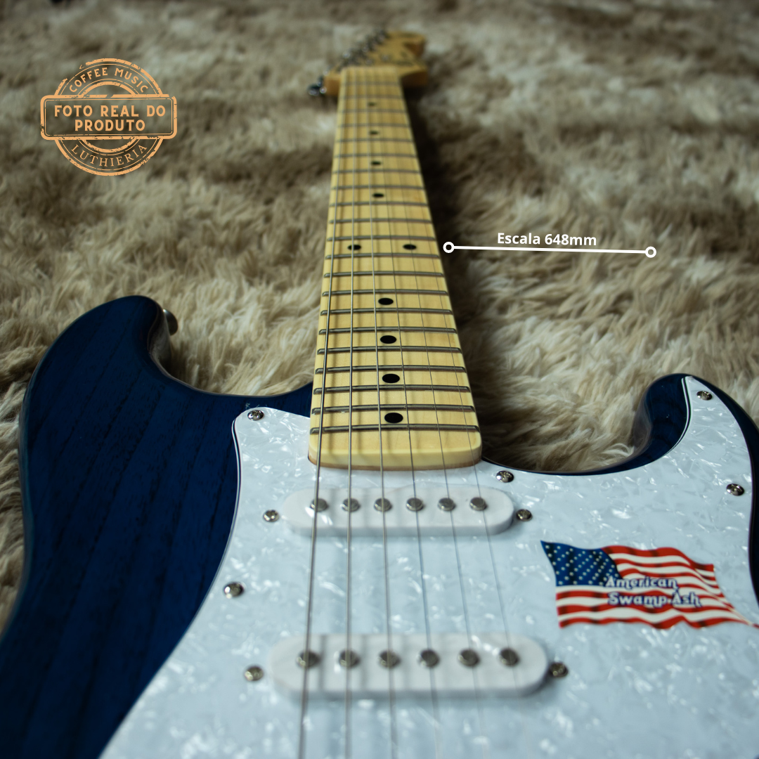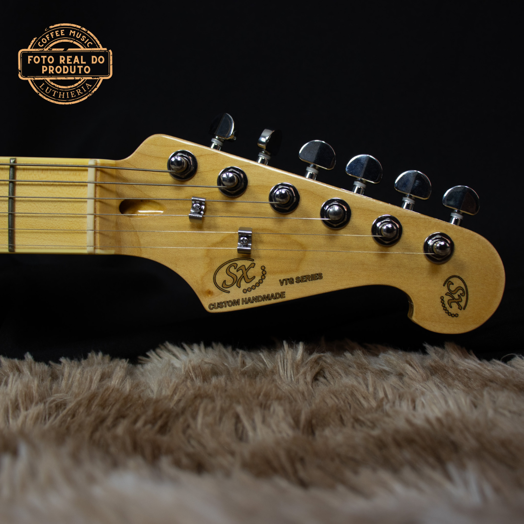 A guitarra SX SST Swamp Ash conta com 21 trastes, corpo em Swamp Ash, braço em Maple, escala em Rosewood, 3 singles, tremolo standard, 2 controles de tonalidade, 1 volume, chave de 5 posições, marcação dot, ferragens cromadas e chave para regulagem do tensor/ponte.